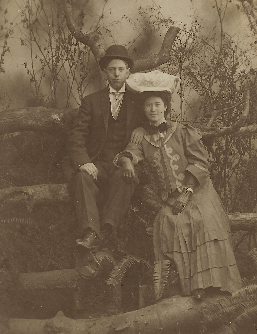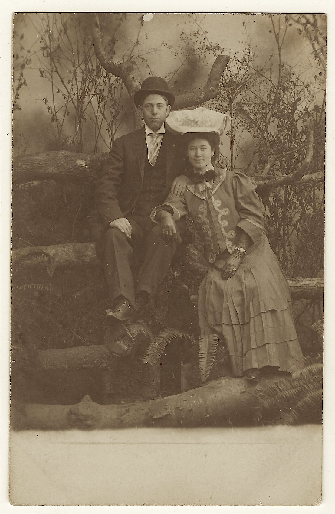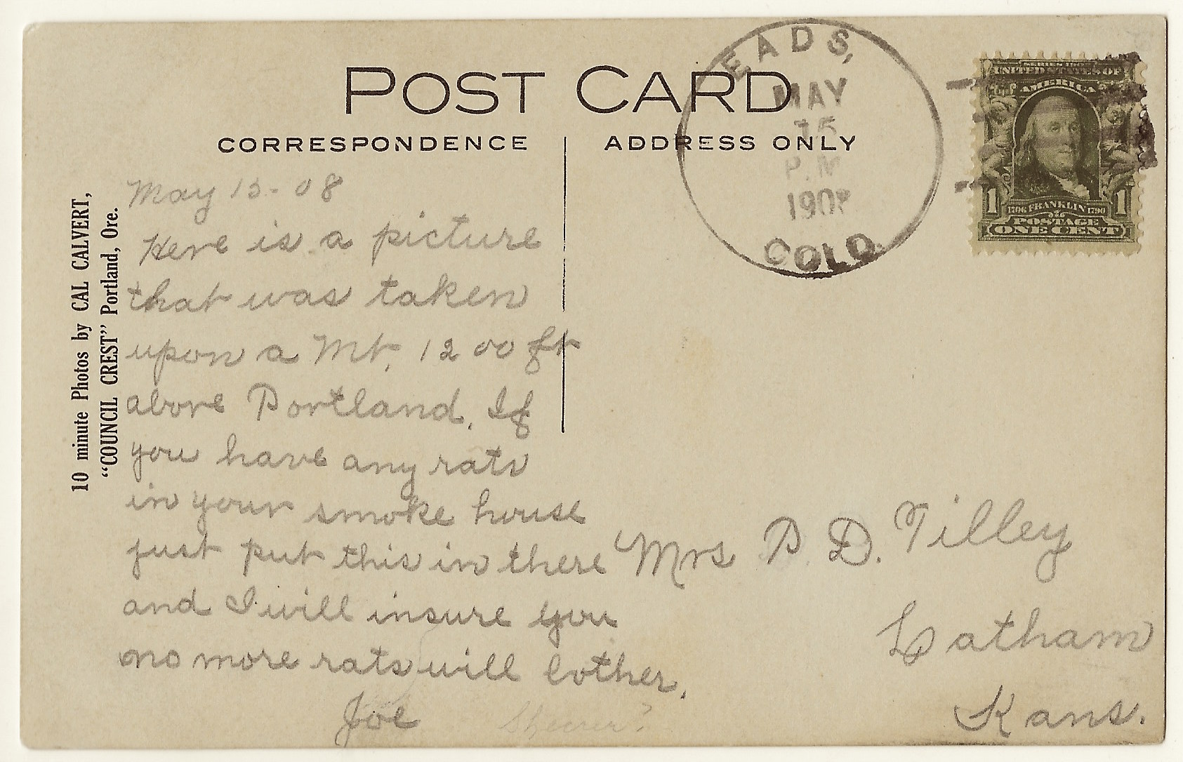 This vintage real photo postcard features a lovely well dressed couple with a sense of humor. The gentleman in the photograph wrote a very funny message on the reverse of the card. The man, Joe, writes that the pair are being photographed on a mountain, twelve hundred feet above Portland, Oregon. He then demonstrated his flair for humor by suggesting to the postcard’s recipient, “If you have any rats in your smoke house, just put this (photo) in there and I will insure you no more rats will bother”. This postcard was sent to a woman in Latham, Kansas, and was postmarked in Eads, Colorado. The card was written and mailed in 1908. Joe and his “lady friend” were photographed at 10 Minute Photos, by Cal Calvert. The studio was located in Council Crest (Portland, Oregon). Council Crest Park is a city park in southwest Portland. Council Crest is 1071 feet above sea leveland is one of the hightest points in in the Tualatin Mountains. The park offers a great view of Portland. The couple in this photo may have taken a street car to the park. The Portland Railway, Light and Power Company opened a street car route (Council Crest Line) to the park in 1906. In 1907 the company opened an amusement park at the site. Research found information related to the photographer who took this photograph. Charles E. (Cal) Calvert operated his studio at Sixth & Ankeny from 1906 through 1930. In 1907, with the opening of Council Crest Amusement Park, he operated a studio and postcard stand on it’s grounds. He also ran a studio at the Washington Street entrance to Portland’s City Park in 1910. Cal was known for his use of rustic props and for his creativity. One of his sets involved subjects appearing as if they were flying an airplane over the city of Portland. A postcard employing this setting is part of a collection at the Portland Art Museum. SOLD