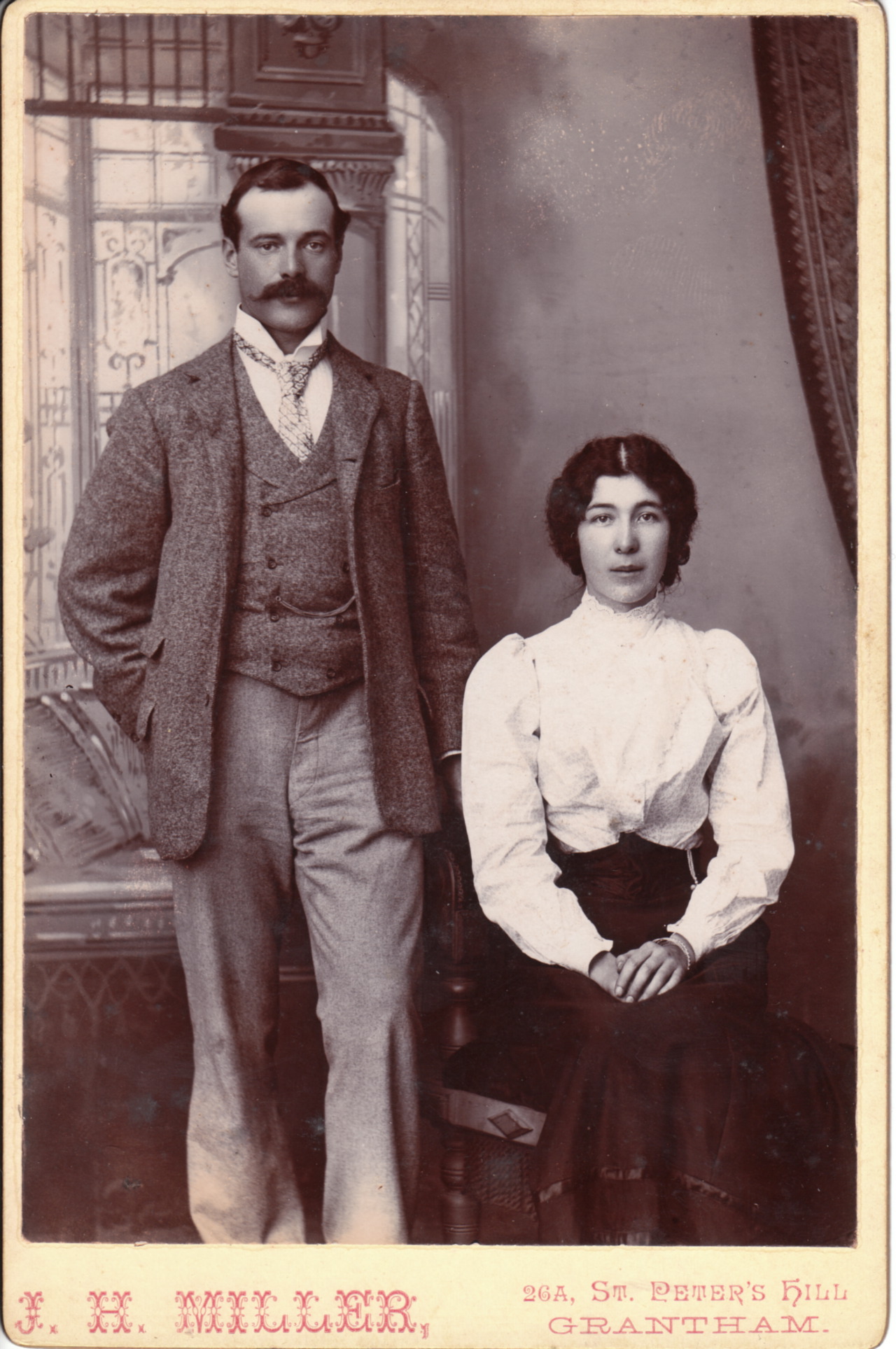 This cabinet card features a very cool and composed couple posing for their portrait at the photographic studio of J. H. Miller in Grantham, England. Grantham is 24 miles east of Nottingham and is the birthplace of Margaret Thatcher. Grantham is also noted for being the first locale in Great Britain to employ female police officers (1914).