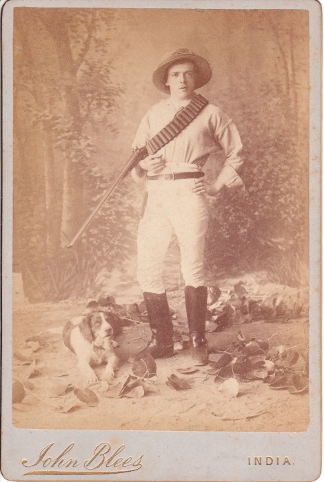 This cabinet card features a hunter and his gun and his dog. The young man is dressed for he hunt with his high boots and his wide brim hat. His dog is lying down and looks to be awaiting his master’s command. The photographer is John Blees, who is the author of the book, “Photography in Hindustan: or Reminiscences of a Traveling Photographer (Bombay, 1877).
