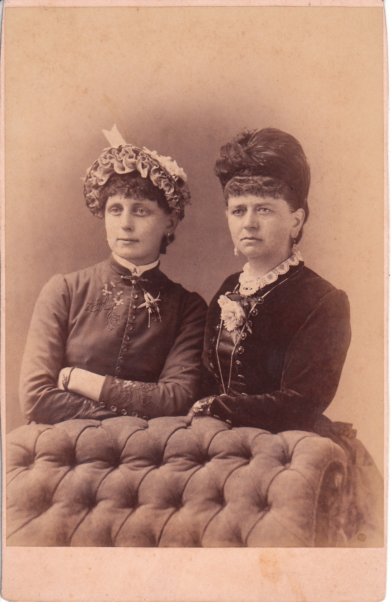This Cabinet Card photograph captures two angry sisters posing at McKinnon’s Portraits, in Jacksonville, Illinois. These sisters do not seem happy; in fact, the sister with the darker dress is displaying quite a scowl. Writing on the reverse of the card indicates that the women are sisters. Their names are Mrs Annie Knight of London, England, and Mrs Agnes Jackson of Jacksonville, Illinois. Perhaps the woman are in conflict, or are just having an aggravating experience at the photographic studio. The women are beautifully dressed for the taking of the photograph and wearing flowers to enhance their appearance.