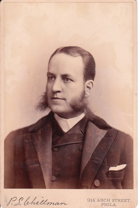 A gentleman with unfriendly mutton chops poses for his portrait at the studio of P. E. Chillman in Philadelphia, Pennsylvania. Why use the adjective “unfriendly”? The answer is that the term “friendly” mutton chops refers to mutton chops that are joined by a mustache. This gentleman’s mutton chops lack a connecting mustache, thus, the mutton chops are not friendly. To learn more about Chillman and to view other photographs by him, click on the category “Photographer: Chillman”.