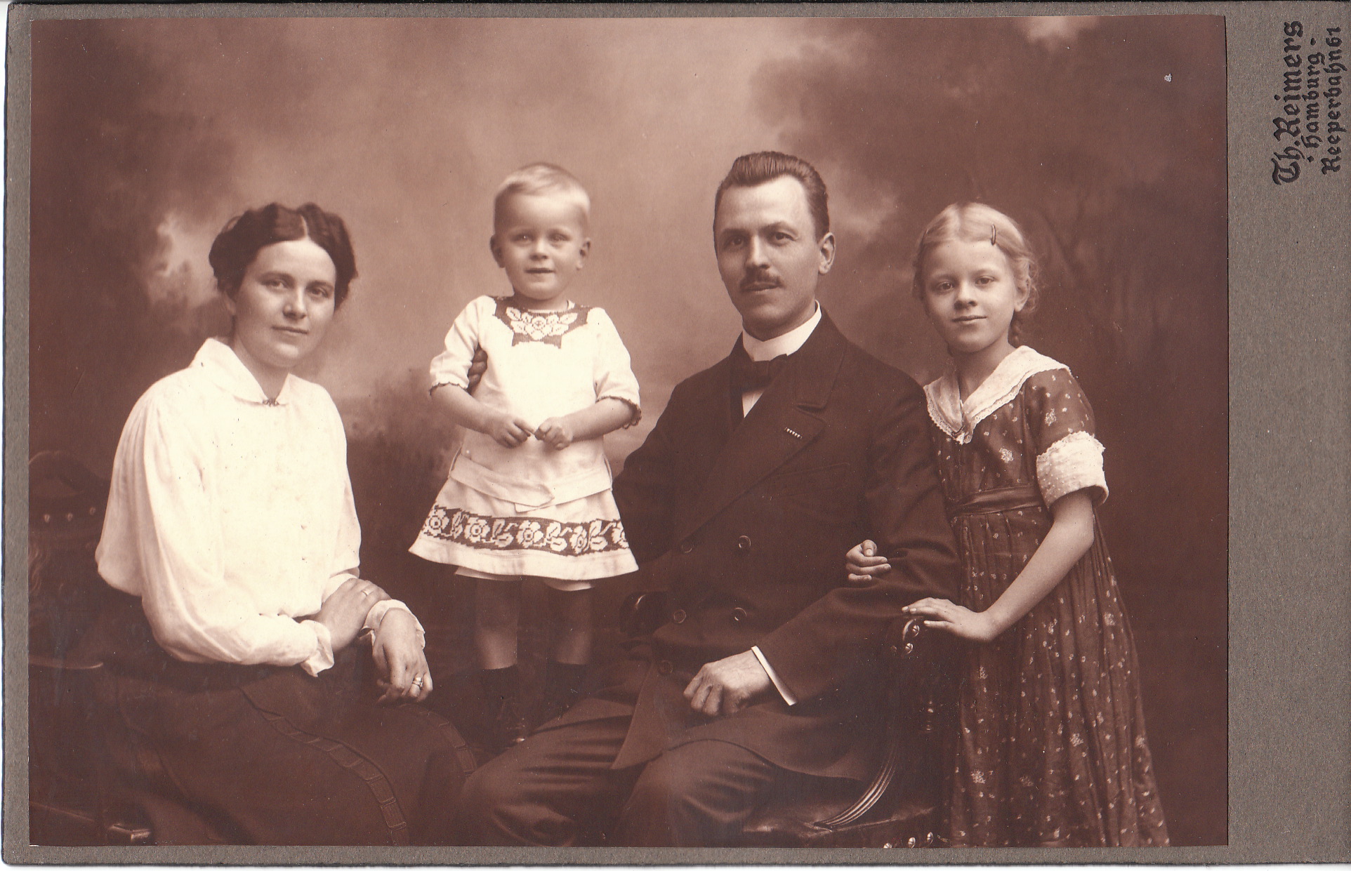 A very attractive family poses for their portrait at the photographic studio of Theodore Reimers in Hamburg, Germany. Both the parents and the children have wonderful smiles captured by the photographer.