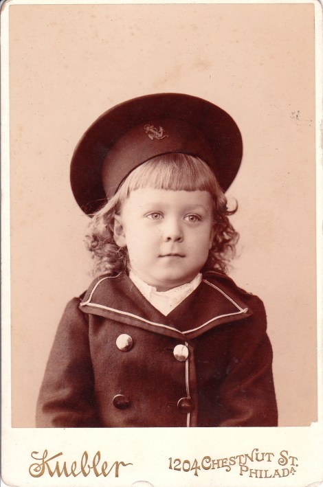 Meet Willie Howard Smith. He was three and a half years-old at the time of this photograph, which was in 1890. Willie is adorable as he poses for his photograph in his sailor suit. He is wearing a wonderful cap which is covering his longish hair. The photographer of this cabinet card portrait is Kuebler, who was located in Philadelphia Pennsylvania. Research discloses some interesting information about the photographic studio. The studio was co-owned and operated by brothers William Kuebler and Louis H. Kuebler. They were very successful photographers and one of their photographs of Walt Whitman is very well known among those that study the great poet. A news article in The Photographic Times (1888) announces the “largest contract ever made in the photographic line” had been awarded to William Kuebler to photograph the members of the Mexican Typical Orchestra. In all, 4,750 photographs were ordered.