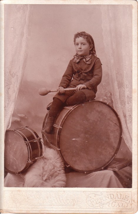 This cabinet card features a bow tied young boy posing with two drums in the studio of A. W. Gilfillian, in Ferndale, California. The reverse of the card has an inscription that identifies the subject as Arthur Robinson, who was “part of a traveling minstrel show” during the late 1800’s. The inscription also dates the photograph “before mom’s visit in 1895”.