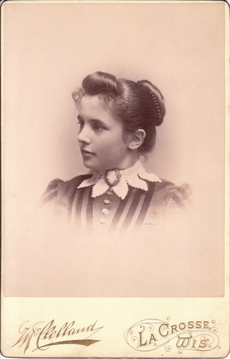 A pretty woman poses for her portrait at the studio of McClelland, in La Crosse, Wisconsin. She has an innocent and wholesome appearance. She looks like the pretty girl next door. She is wearing her hair in a bun and has an interesting lace collar. The collar is scalloped and the scallops look like the petals of a flower. She is wearing a cameo at her collar.