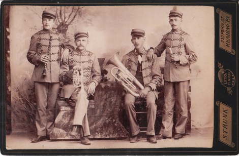 I have a similar photo of these four men and their instruments. The third one is possibly my great grandfather Peter Eckenroth. Not sure who the rest are. My photo looks like it was taken maybe a couple of years after this one.