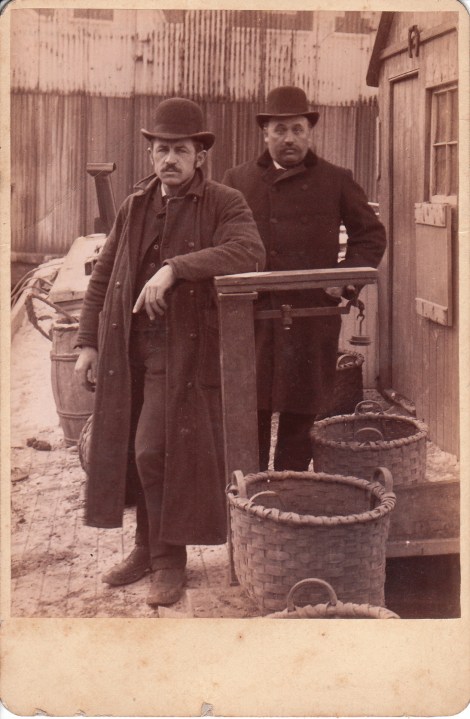 What a photo. I think the baskets are cotton baskets, but I could be wrong. I would date it c. 1883. I don’t think they are wearing cowboy boots. Men west of Missouri have a tendency to wear boots. I suspect it is in the back of some sort of a shop.