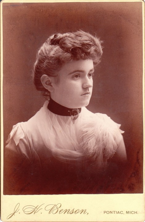 A young woman is featured in this cabinet card photograph by J. H. Benson, in Pontiac, Michigan. The photographer did an excellent job of utilizing light in this portrait of a well dressed and well coiffed woman. John H. Benson was a native New Yorker. Directories from 1863 and 1875 indicate he conducted business in Saginaw, Michigan. Perhaps he moved to Pontiac in the later years of his career. Benson died in 1901.