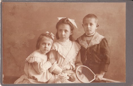 This cabinet card features a young boy holding a tennis racquet as he stands along side his two sisters. The children are adorable, but the youngest girl appears absolutely terrified. The boy is wearing a sailor suit outfit. The name of the photographer and the location of the studio is unknown.