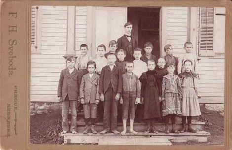 This cabinet card offers a glimpse back into historical times of the American education system. This image dates back before “teaching for the test” was standard policy for many school districts. Sixteen children are posed in front of their schoolhouse. Their young teacher stands behind his class. The children seem to have dressed nicely for “picture day”,  but at least a couple of the boys are barefoot. F. H.Svoboda was the photographer of this image and his studio was located in Prague, Nebraska. At one time, Svoboda published the first, and only,  Czech juvenile magazine in Nebraska. He was a school teacher and later engaged in photography. In 1909, he began to publish the Schuyler Messenger, which existed until 1920. The Messenger was a weekly newspaper in Schuyler, Nebraska. The town of Prague has an interesting history. Its early inhabitants included many Czech settlers who arrived in America seeking prosperity during the 1880’s. In 1887, the town was built to support a newly established railroad station. The town was built by the Lincoln Land Company and became a thriving community catering to the agricultural economy of the area. The largest business in the town was a lumberyard. The town’s name, Prague, is named after the capital city of Czechoslovakia.