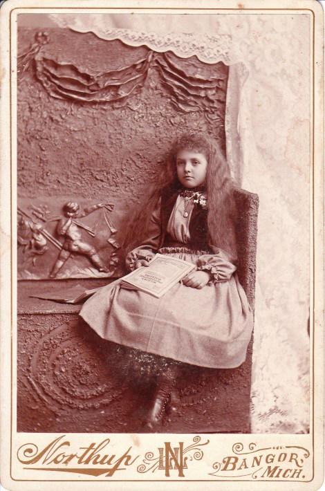 “Gimme head with hair. Long beautiful hair. Shining, gleaming streaming flaxen, waxen. Give me down to there hair. Shoulder length or longer.” The photograph reminds one of the lyrics of the song “Hair” which was performed in the play of the same name.  It seems likely that the adorable little girl in this cabinet card photograph, heard many comments about her beautiful hair. She is wearing a pretty dress and is holding a copy of Wilson’s Photographic Magazine. Posing the girl with this magazine, probably because it was conveniently available in the studio, doesn’t seem quite appropriate. The photographer could have had her bring something personal (ie a doll) from home, or provided her with a prop more relevant for a child.  The dreamy eyed little girl in this photograph is sitting on a very interesting and unique bench. She is wearing flowers near her collar and a necklace with a locket. Northrup, the photographer of this cabinet card, was located in Bangor, Michigan.