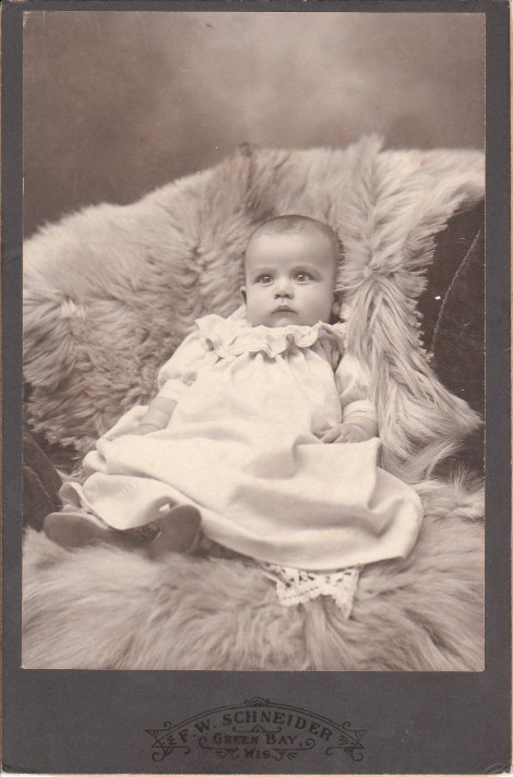 A wide eyed baby is photographed by F. W. Schneider, in Green Bay, Wisconsin. the baby is lying on fur and wearing a long gown. The book, “A History of Brown County, Wisconsin, Past and Present Vol. 2” (1913) reveals that Schneider was born and raised in Niederschelden, Germany. He emigrated to the United States in 1868 and settled in Green Bay in 1874. Schneider operated a photographic gallery until 1911, when his son, C. Alvin Schneider, succeeded him. “The Bulletin of Photography” (1922), noted F. W. Schneider’s death from heart disease. Schneider was 68 years old at the time of his death, and it was reported that he had operated his studio for 38 years. An interesting side note about Green Bay is that it was established in 1634 by the French as a small trading post. The town’s original name was “La Baie des Puants” (“The Stinking Bay”).