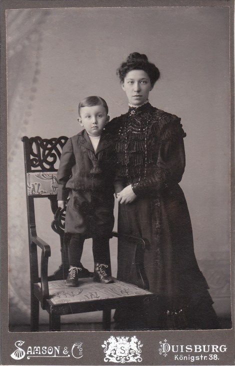 A stylish mother and son pose for a portrait at the studio of Samson & Company in Duisburg, Germany. Mom has an interesting beaded dress, and a pin on her collar. The son has perfectly combed hair, and is wearing a cute short suit. He seems to be a bit intimidated by his day at the photographer, and is likely happy to be standing so close to his mother. Duisburg is a city in Germany and is located in the western part of the Ruhr area. To view other photographs that may have been produced by this photographer, click on the category, “Photographer: Samson & Co.”. The tentativeness of the previous sentence is because the other Samson & Company photograph was not produced in Duisburg. In fact, the other photograph was created at a gallery in Karlsruhe, Germany. The different locations of the Samson galleries makes one wonder if both of these photographic studios were operated by the same photographer. The two galleries were located 187 miles (300.88 kms) apart.