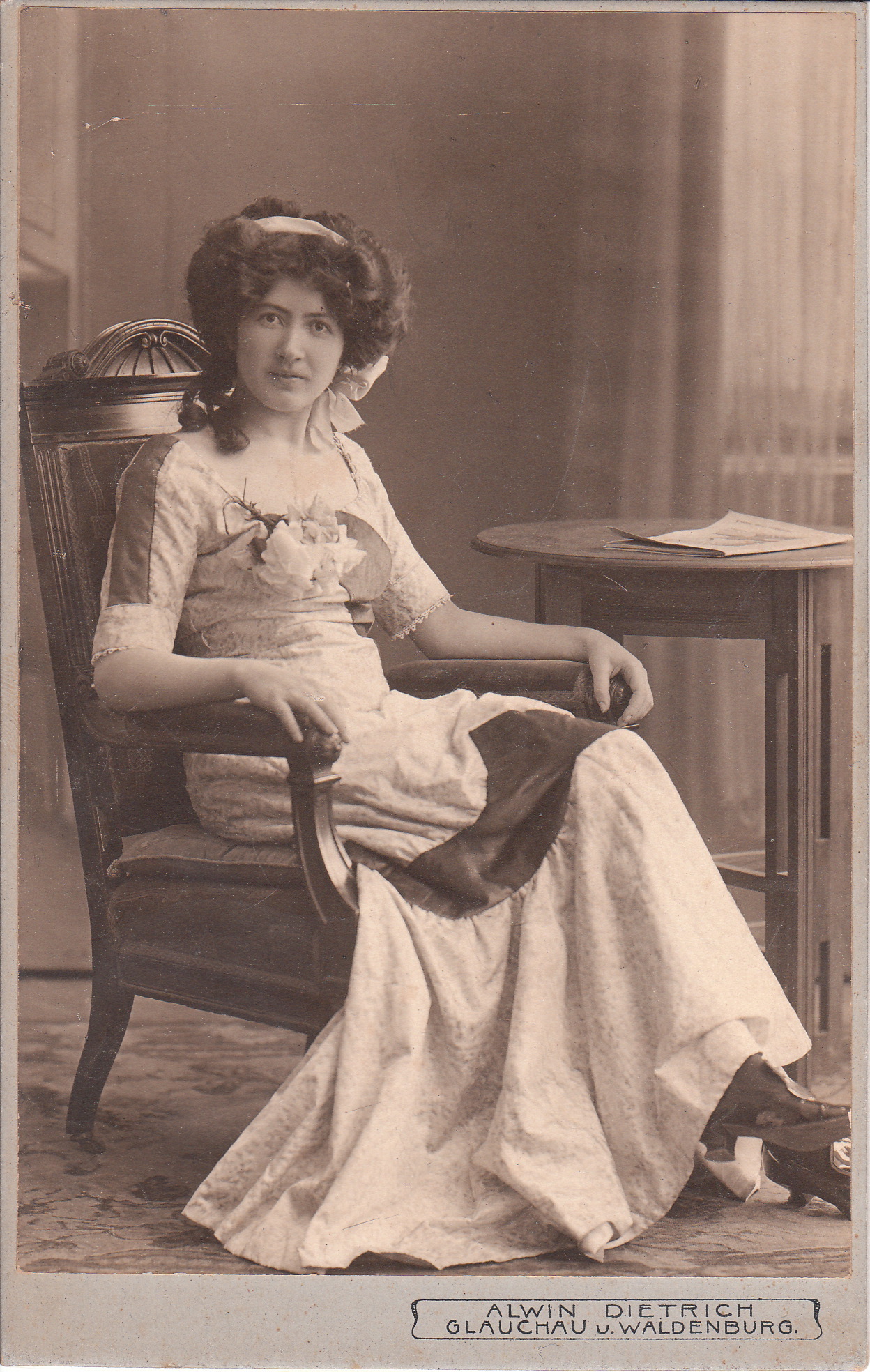 A photographer named Alvin Dietrich photographed this perplexed looking young woman sitting in a chair. Dietrich had photography studios in Glauchau and Waldenburg, Germany. The woman is wearing a hair band and a bow. She is not wearing jewelry. Note the flowers pinned near the top of her dress. A newspaper sits on a table behind her.