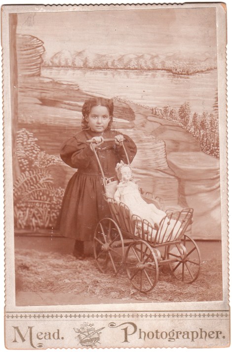The little girl featured in this cabinet card is absolutely adorable in her pose pushing her doll in a baby carriage. The backdrop in this photograph is absolutely not adorable. The screen is so amateurish that it looks like it was painted by a group of the subject’s classmates. The photographer of this image has the last name of Mead. Unfortunately, the location of his studio is unknown. It is an unusual occurrence that the name of the photographer is listed on the cabinet card without an address of the studio. After all, photographers used cabinet cards as free advertising by listing their location and special talents. The reverse of the cabinet card has an inscription that indicates that the subject of this portrait is named “Mamie Cole (Griffis)”. There were many Mamie Coles, Mamie Griffiths, and photographers named Mead living in the United States during the cabinet card era. It is impossible, with available information, to truly identify both subject and photographer. It is interesting to note that there was a photographer in the Dakota Territories name Josiah J. Mead and a woman named Mamie Cole who was born in South Dakota in 1894.