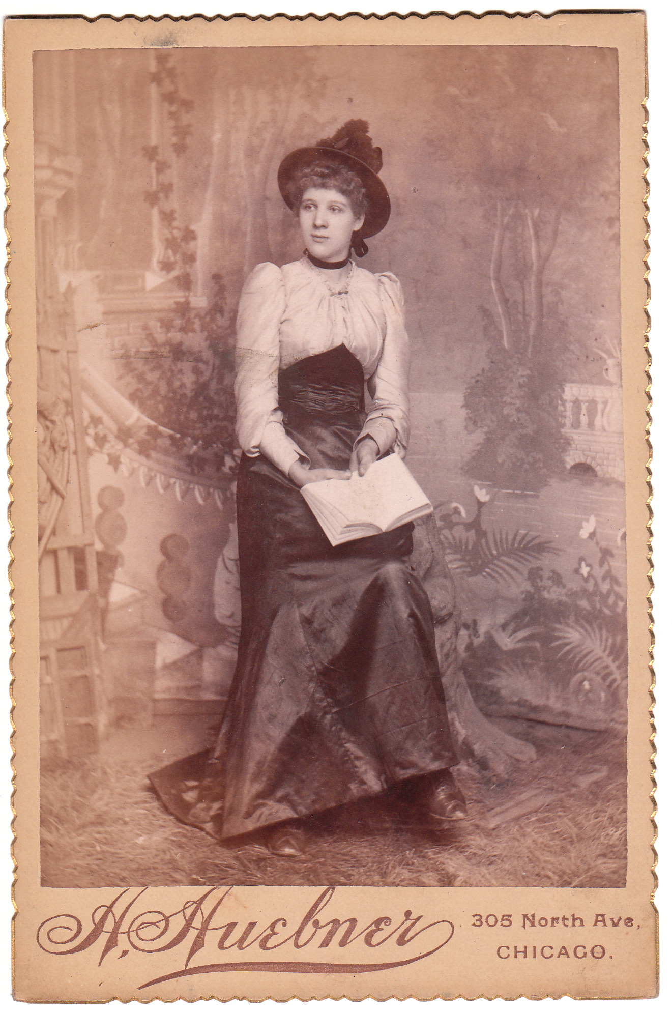 A thinnish young woman poses for her portrait at the studio of H. Huebner in Chicago, Illinois. She is dressed nicely and hopefully a visitor to the Cabinet Card Gallery can tell us more about her dress. The design of the dress seems unusual and I am particularly interested in what material the dress is made from. The young woman is holding an open book.The previous owner of this image hypothesized that the subject of this photograph was a school teacher.