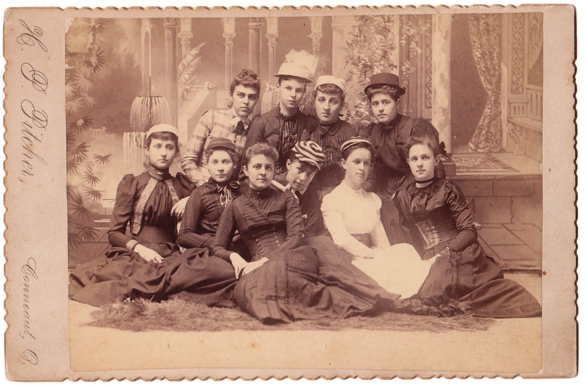 Ten well dressed young ladies pose for a group portrait in Conneaut, Ohio. The photographer is H. P. Pitcher. Note the women’s great hats, especially the striped hat worn by the woman near the middle of the bottom row of ladies. Two of the ladies in the photograph are holding what appears to be a spread handkerchief. Perhaps a visitor to Cabinet Card Gallery can explain why the women are holding the handkerchief in that manner for a portrait. The previous owner of this cabinet card hypothesized that the group of young women are school friends. Photographer, Harvey P. Pitcher was born in Trumbull County, Ohio in 1847. He was the son of a farmer. His parents hailed from New York. He left his fathers farm at age twenty and quickly learned the field of photography in Conneaut. In 1872, he married Miss Jennie Press of Conneaut. He died in 1907. Most of the information cited about Pitcher comes from the “Biographical History of Northeastern, Ohio” (1893).