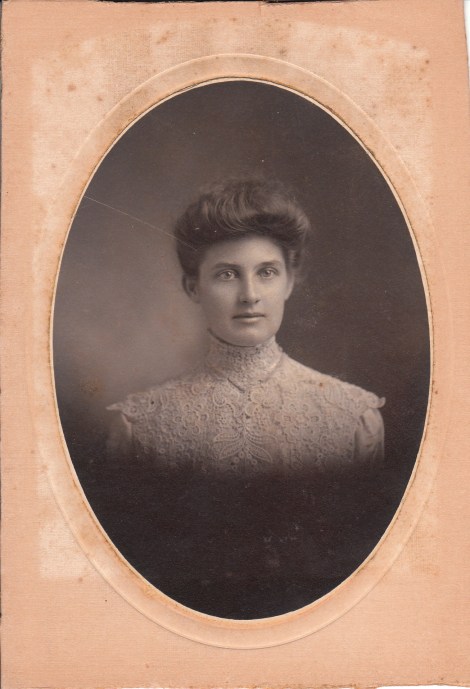 A pretty woman is featured in this oval photograph by an unknown photographer. The woman has a “Gibson Girl” hairstyle. It appears that a previous owner trimmed the picture to fit it into a frame.