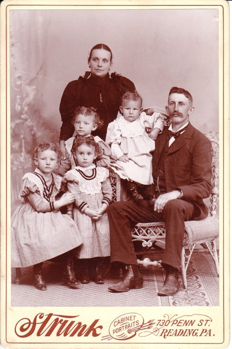 John D. Strunk , a photographer from Reading, Pennsylvania, produced this portrait of an attractive young family. Mother and father pose with their four young children. The children are so close in age that it is possible that two of them may be twins. The two girls in the front of the photograph are wearing similar but not identical dresses. Perhaps their mother made them with the same materials and creatively gave them some variation. This image is an excellent family portrait which manages to capture each child in a reasonably good pose. An advertisement on the reverse of the photograph boasts “Instantaneous Portraits of Children Successful Specialty”. The self promotion appears to be well deserved. To view other photographs by the Strunk gallery, click on the category “Photographer: Strunk”.