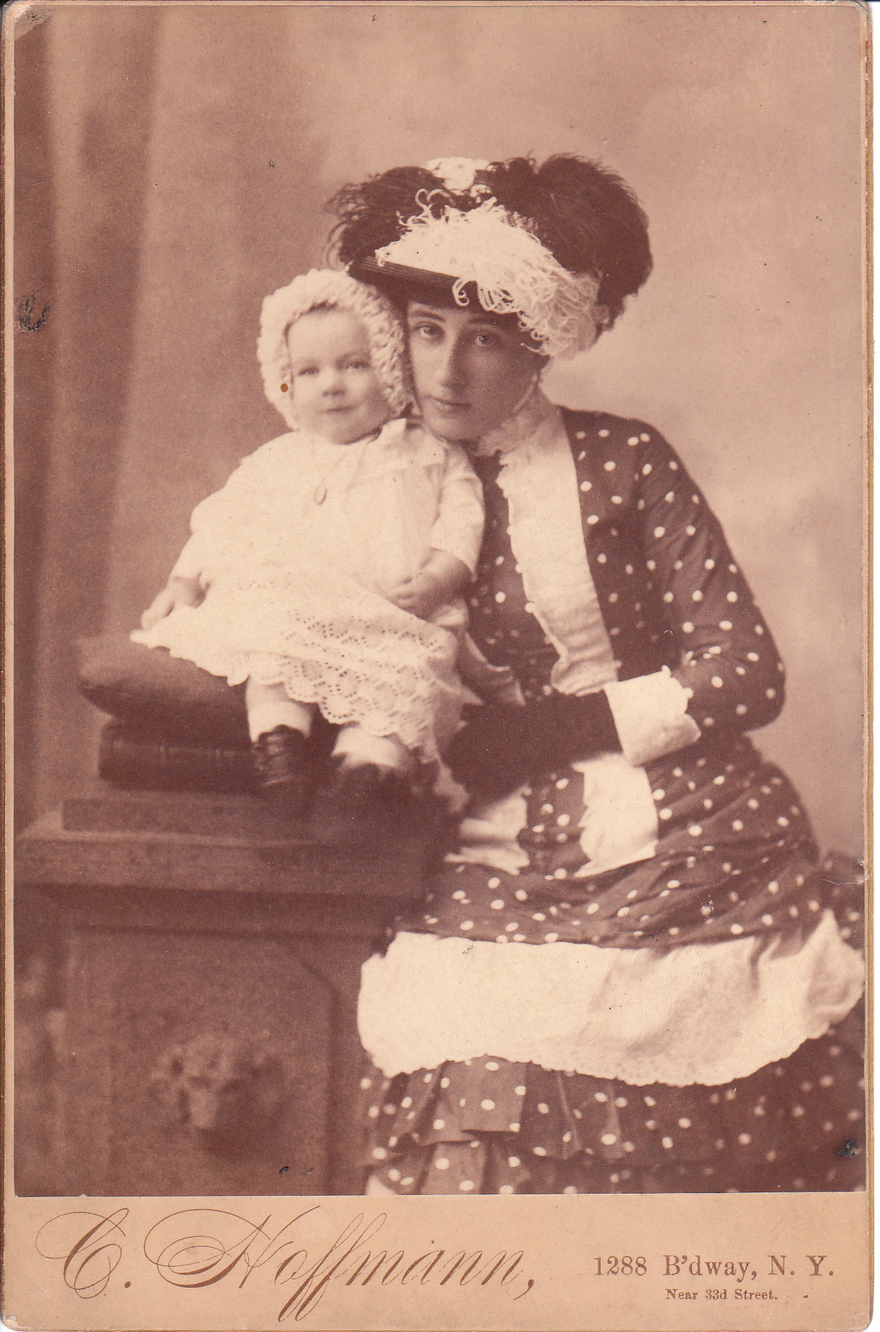 A pretty young mother poses with her baby for a portrait by Charles Hoffman in New York City, New York. Mom certainly has no aversion to attracting attention judging by her polka dot dress and fantastic hat. She has a flair for putting an outfit together; her dress, hat, and dark gloves are a good match. Mother seems to also have no trouble showing affection to her young child. She holds her head very close to the baby head which is likely a reflection of the closeness she feels to her baby. The book, Great Industries Exchange and Commercial Review (1884), mentions photographer Charles Hoffmann. The citation states that he had recently established his 1288 Broadway studio after working 18 years in the “famous house of Sarony” in an important position. To view photographs by Napoleon Sarony, click on the category “Photographer: Sarony”.