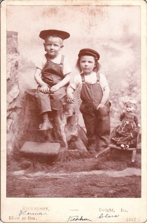 This cabinet card features a portrait of adorable siblings named Herman and Clara Stephens and a porcelain doll standing on a miniature chair. The children are wearing overalls and cute hats. The photograph was produced by the Mickelson studio in Dwight, Illinois. The photograph is dated 1897.