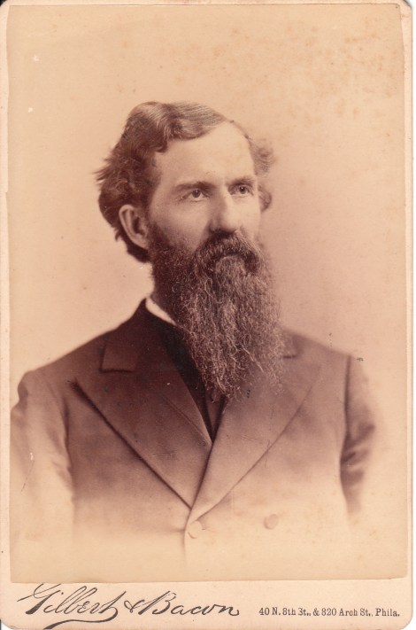 This cabinet card portrait features a handsome man with a wiry beard. His beard qualifies him to enter the cabinet card gallery’s category “Beards (Only the Best)”. Click on the category to see an interesting photographic collection of men with notable beards. This photograph was produced by the Gilbert & Bacon studio in Philadelphia, Pennsylvania. To view other photographs by this studio and to learn more about the photographers, click on the category “Photographer: Gilbert & Bacon”.