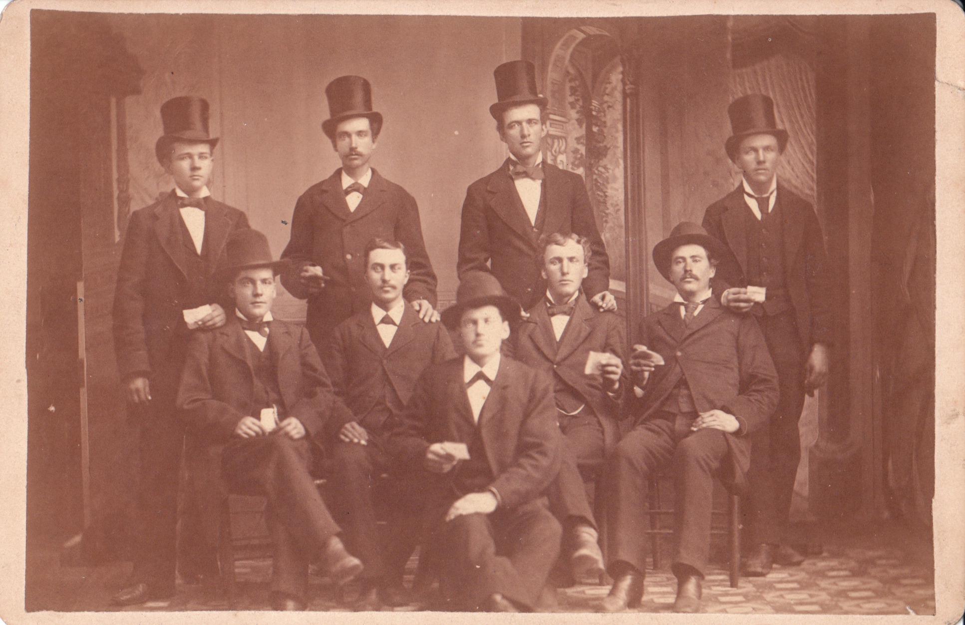 This photograph features nine men “dressed to the nines”. What does “dressed to the nines” mean and where does the term derive from? It basically means that these guys are fashionably and elaborately dressed. Research reveals that the derivation of the phrase “dressed to the nines” is unknown. There are a lot of theories but no real evidence to support a single theory. So who are these guys and what group do they represent? We run into another wall in an attempt to answer these questions. The men in this image are unidentified and the photographer is unknown. This photograph is one of those images that is similar to a psychological projective test. We have to make up our own story to better understand the photograph. The story we create is a reflection of our experiences and personality. The story I tell myself is that these men are part of a club or organization. They are dressed formally for some sort of special organizational event. The papers that they are holding are possibly certificates for some type of accomplishment, ballots, or invitations. What’s the story you tell yourself about this image? You are invited to leave a comment with your impressions