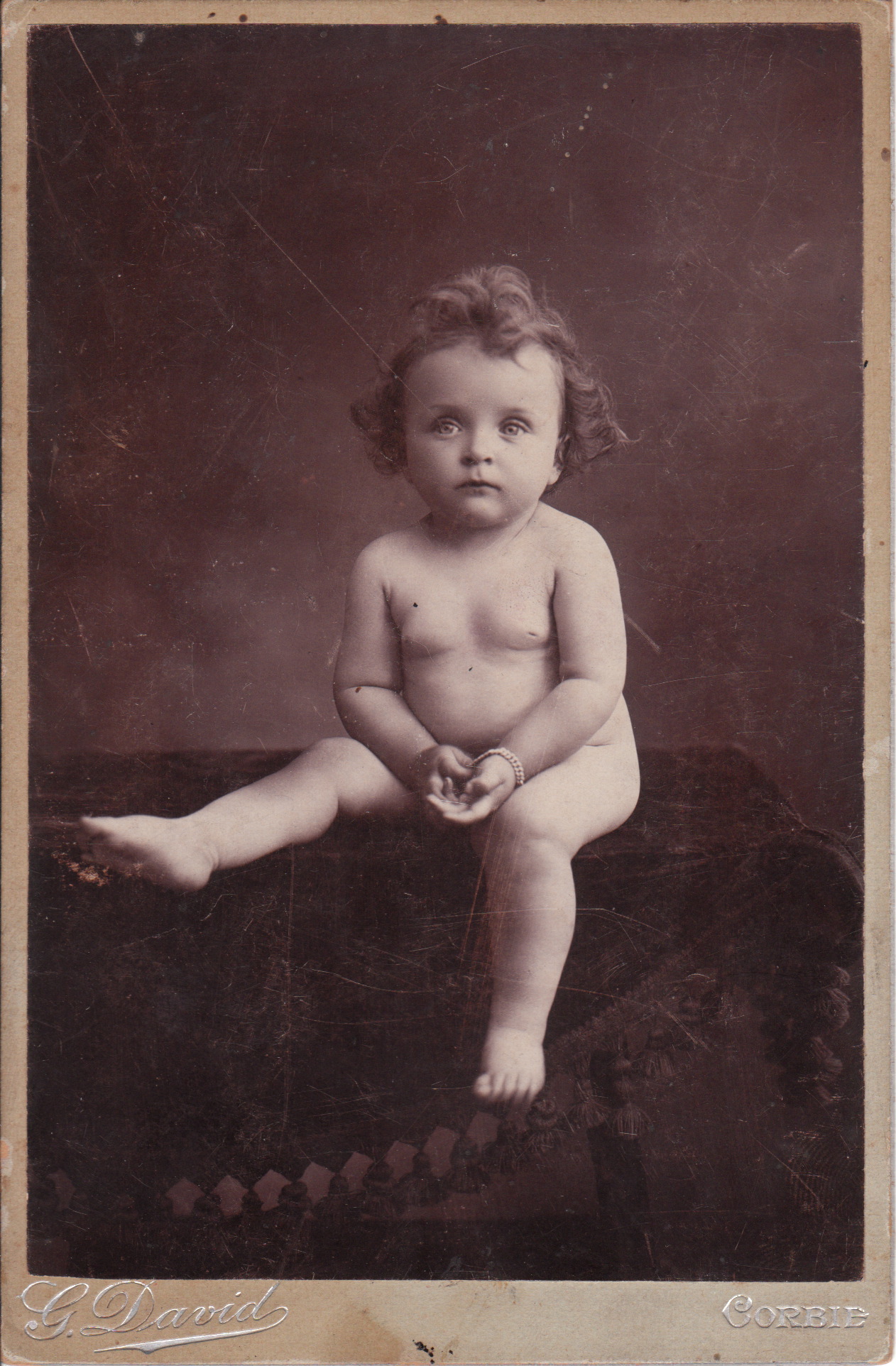 Can a baby be poised? If so, than the baby in this photograph certainly seems poised. The child actually has a “stage presence”. He or she is a perfect candidate for doing television commercials. Unfortunately television is decades away from being invented, so this child must settle for still photography. The baby in this photograph is very well posed. The baby is adorable and the positioning and lighting is terrific. The skilled posing also helps this image get past the Corbie Cabinet Card Censoring Committee (otherwise known as the C.C.C.C.C).. The photographer of this image is the David studio in Corbie, France. Corbie is a town in the north of France. attentive baby