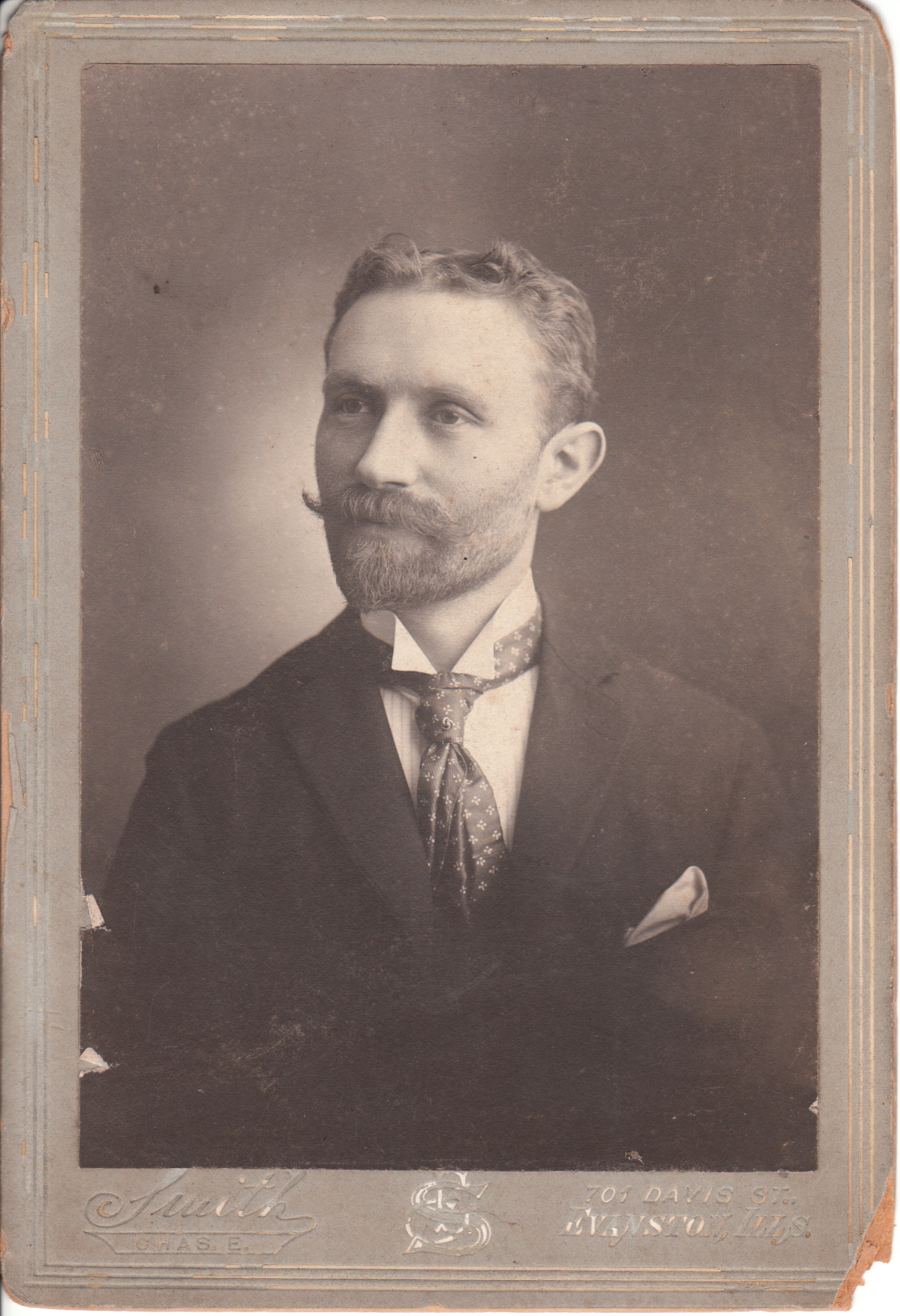 Photographer Charles E. Smith photographed the gentleman in this photograph at his studio in Evanston, Illinois. The studio was located at 701 Davis Street. The subject is well groomed and well dressed. His pose in this portrait gives an appearance of confidence. Photographer Smith is cited as an exhibition participant in the Bulletin of Photography (1912)