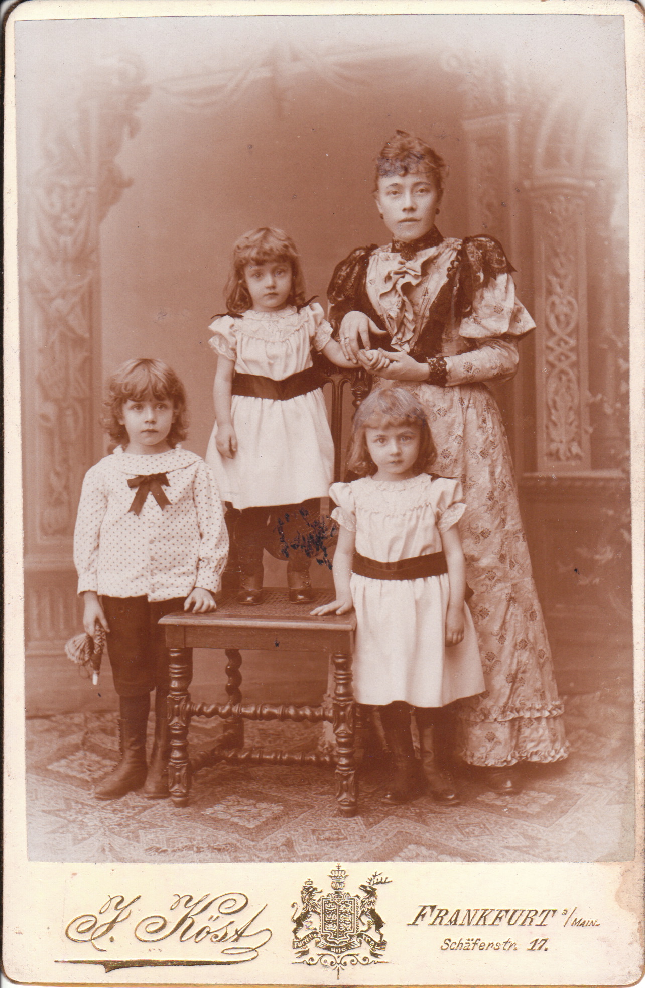 A mother and her three adorable children pose for the portrait at the studio of F. Kost in Frankfurt, Germany. The well dressed mother is holding the youngest child’s hand and appears to be stroking it. The little boy is holding an object that may be a toy. The children all have identical hair styles.