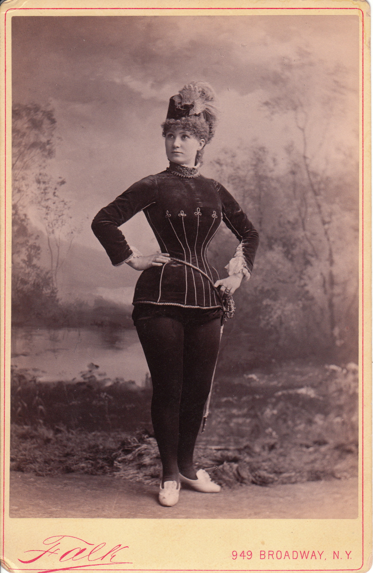 Stage star, Annie Somerville is featured in this cabinet card portrait by celebrity photographer Benjamin Falk in New York City. The curly haired actress is pretty and thin waisted. She is wearing a velvet type costume and has a sword at her side. Research yielded little information about Miss Somerville. She appeared in a number of actress series issued by tobacco companies. Her named is listed as part of the cast of Evangeline when the play appeared at the Fourteenth Street Theater in New York City. The reverse of the photograph has the stamp of photographer J. M. Russell, 126 Tremont Street, in Boston, Massachusetts. Russell was a well known music publisher in Boston and it is possible that he also was involved in the sale of celebrity cabinet cards. To view other photographs by Falk, click on the category “Photographer: Falk”.