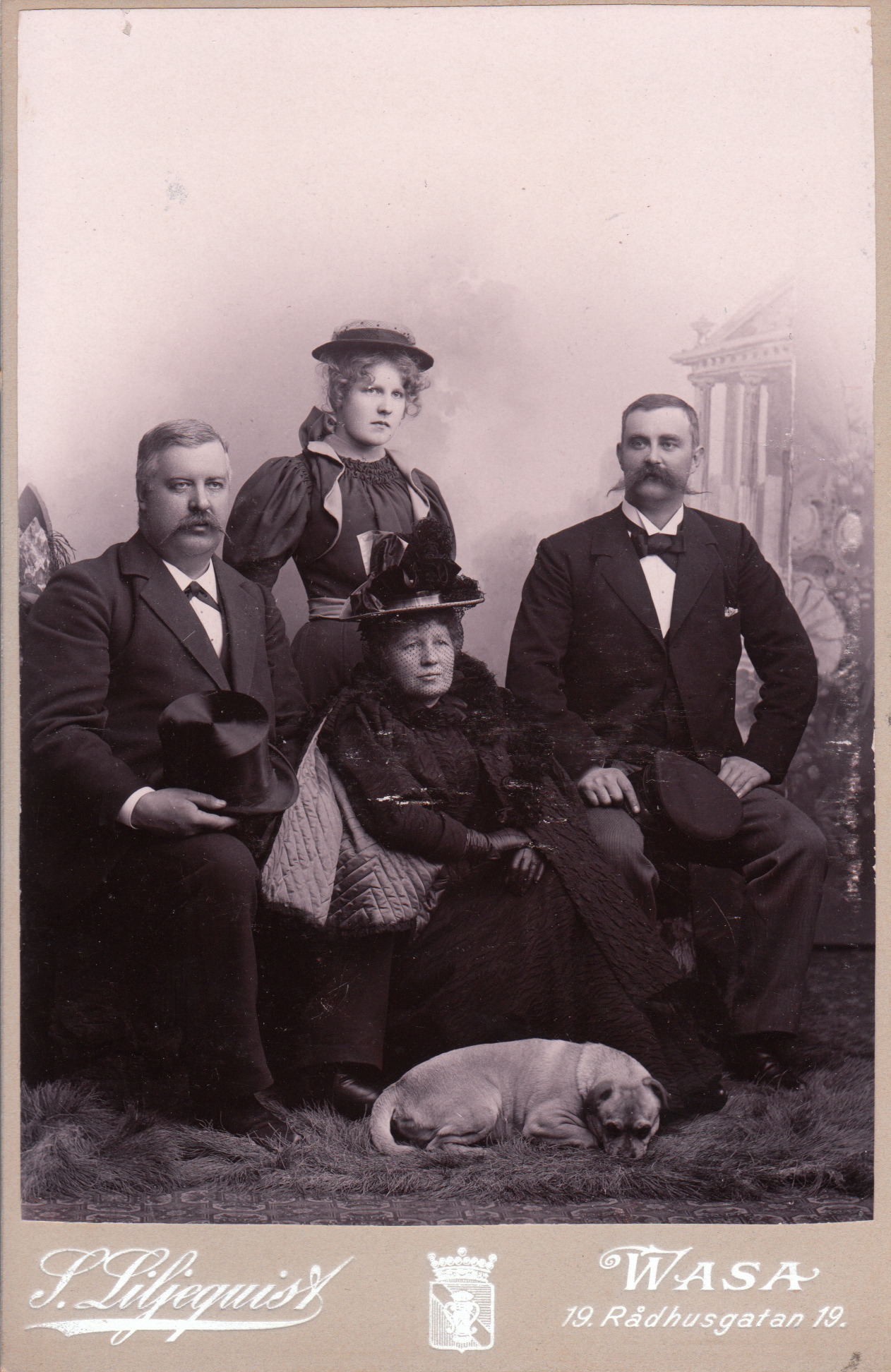 Signe Liljequist photographed these two couples and a small dog in his studio in Waasassa, Finland. It is very possible that the older pair are the parents of the two younger adults. The younger and older man share what appears to be a family resemblance. The four subjects in this photograph are nicely dressed and the younger man has an admirable mustache. To view other great mustaches, click on the category “Mustaches (Only the Best)”. The town of Waasassa has held a number of other names over history. Presently, the town is called Vaasa. To view other Finnish photographs, click on the category “Finland”.