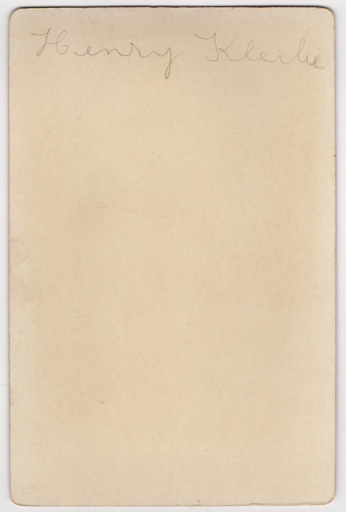 Henry Kleilie sits for his portrait at Hoefle’s Studio in Brooklyn, New York. He doesn’t seem to be having a very good day judging by the prominent scowl seen on his face. He is well dressed and is sitting on a wicker chair. Research yielded no information about Mr. Kleilie and it is possible that I am not deciphering his name correctly from the handwriting on the reverse of the photograph. It is also possible that that the inscriber misspelled the subject’s name. I have provided a scan of the inscription which can be seen above. The Photographic Times (1904) reported the death of Mr. G. Hoefle, the photographer of this cabinet card. Hoefle died in late 1903 of “paralysis of the heart” at sixty years of age.