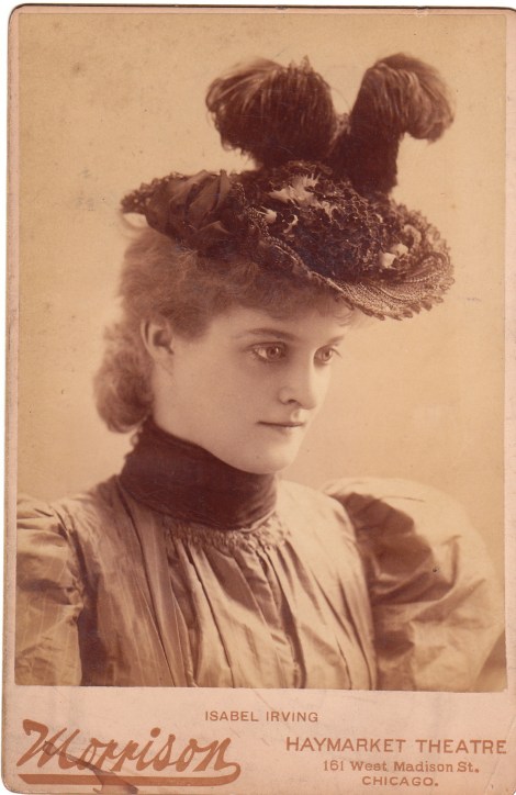 Isabel Irving (1871-1944) was an American actress born in Bridgeport, Connecticut. Her stage career began in 1886. She performed in many performances of Shakespeare. She was also in more than 30 Broadway plays between 1894 and 1936. These plays included “Merry Wives of Windsor” (1917) and “Uncle Vanya” (1930). The first cabinet photo was done at the studio of Napoleon Sarony in New York. Sarony was a very famous photographer of his time and known for his photos of theatrical performers and other celebrities. The second photograph comes from the studio of William McKenzie Morrison who was located in the Haymarket Theatre building in Chicago, Illinois. The third cabinet card portrait features Miss Irving photographed by celebrated New York photographer Benjamin Falk. The fourth cabinet card was produced by Pach Brothers studio in New York City. To view a photograph of Isabel Irving’s sister, write “Evangeline Irving” in the search box and press search. To view other photographs by any of the four cited photographers, click on the category “Photographer: Falk, Photographer: Sarony, Photographer: Morrison, or Photographer: Pach Brothers.