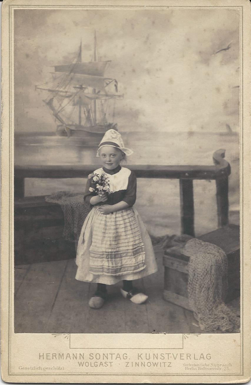 This cabinet card features a little girl and her younger sibling. Big sister seems to be assuming a protective posture in relation to her sibling. Both children share pleasant smiles. Big sister is adorable. She is wearing a pretty dress and her hair is in braids. The younger child is wearing a lace bib and an outfit that has military braided stripes and brass buttons. The photographer of this image is W. J. (possibly W. T.) Richardson who operated his studio in Oneida, New York.