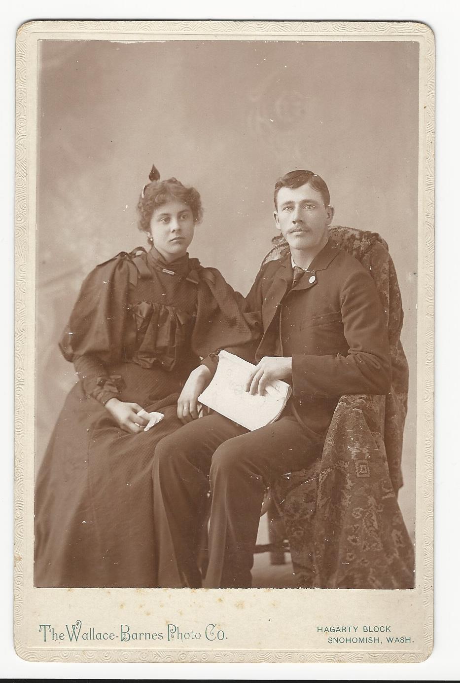 This cabinet card portrait features a young wedding couple dressed for their big day. Both the bride and groom are wearing white gloves and corsages. The pair were photographed by the Brua & Clark studio in Taylorville, Illinois. Preliminary research yielded little information about the photographers. It appears that Brua’s more complete name is B. F. Brua and at one time he was a photographer in Lyons, Kansas. SOLD