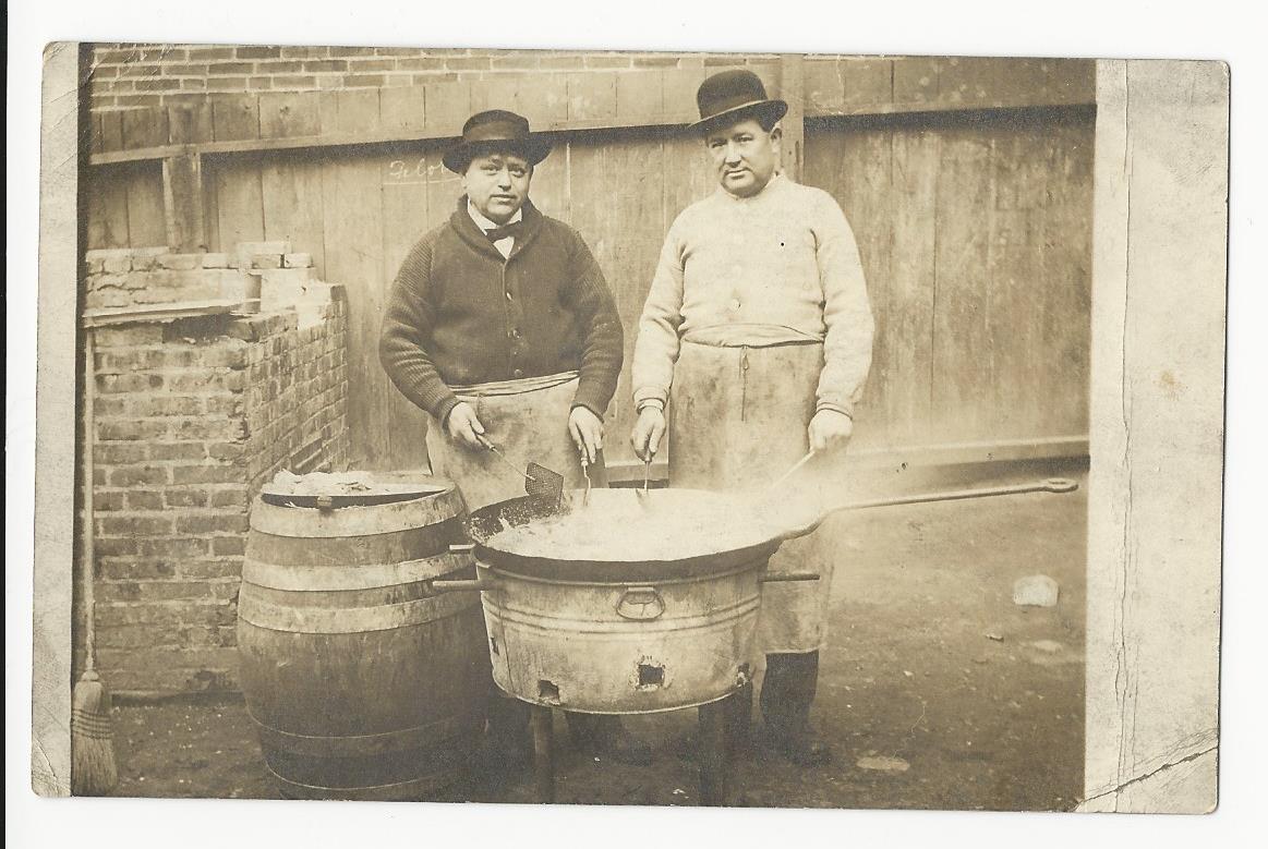 TWO MEN MANNING THE DEEP FRYER AND DOING SOME SERIOUS COOKING (VINTAGE REAL PHOTO POSTCARD)