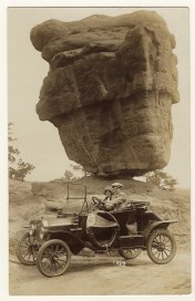 This is one of those vintage real photo postcards that one stumbles upon and is compelled to learn more about. The postcard is a wonderful find. The photograph shows a young couple driving a 1920’s (?) car past “Balanced Rock” in the Garden of the Gods. The popular tourist location is located in Colorado Springs, Colorado. In 1859, two surveyors who were instrumental in setting up Colorado City, explored the area and one of them decided that it would be a great place for a “beer garden”. The second surveyor responded to the suggestion stating it would be better to call it “Garden of the Gods” because it was “a fit place for the Gods to assemble”. Many Native American tribes are connected to this area including the Apache, Cheyenne, Comanche, Utes, and Pawnee people. The Garden of the Gods became a National Natural Landmark in 1971. This postcard does an excellent job of providing a portrait of the “Balanced Rock”. The natural geological formation is put in even better perspective by photographing an open car in front of it’s precarious pose. The viewer holds their breath hoping that the auto and it’s two occupants pass by safely. Note that there is a pennant hanging on the side of the car. Printed on the pennant is “Kansas City”, which is likely the home of the lovely couple in the convertible. This postcard was produced by the Paul Goerke studio in Manitou, Colorado. It is printed on Artura paper and was produced between 1908 and 1924 (presumably sometime toward the end of this span). The story of photographer Paul Goerke is quite interesting. In the 1890’s, Goerke purchased the land around Balanced Rock. Goerke and his son, Curt, took photographs of tourists by the rock and sold them for 25 cents apiece. At the beginning of Goerke’s business there was no charge to view Balanced Rock. They made their money by charging for the portraits. Among the props supplied by Goerke, were burros. As personal cameras became readily available, Goerke needed to change his business concept. Curt Goerke built a wooden fence around Balanced Rock and began charging 25 cents admission. He also operated a lunch counter adjacent to nearby “Steamboat Rock” and created picnic areas for the thousand of visitors who came each summer. In 1932 the city of Colorado Springs purchased The Goerke property and tore down the fence.