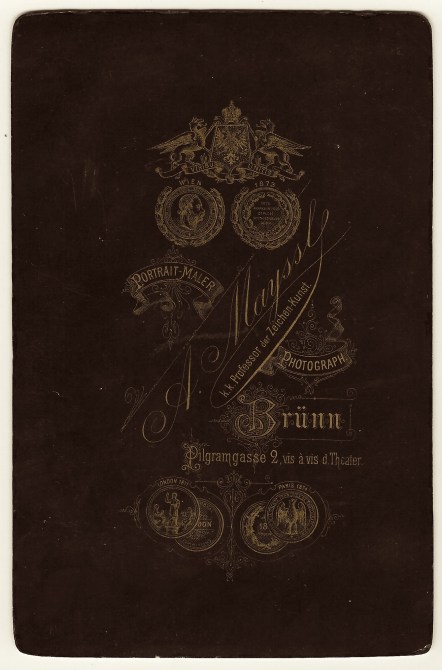 A solemn young girl poses for her portrait at the Mayssl studio in Brunn, Germany. The girl has very long hair. A name is written in the top right corner of the cabinet card. The name likely belongs to the child seen in this image. The photographer, Mayssl had advertising printed on the reverse of the cabinet card. Included in the advertising are drawings of six medals that he had won in various photographic exhibitions.Included are London (1871), Vienna (1873), Paris (1874). The dates of these awards indicate that this cabinet card is likely from the 1870’s. There is also a German phrase on the back of the cabinet card that roughly translates to “Professor of Characters Art” (thank you Google Translate). Perhaps Mayssle was a teacher of photography.