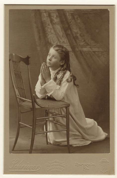 This vintage photograph features a young boy wearing night clothes deep in prayer. He has a far away look as he kneels and looks toward heaven. The photograph was taken by the Schriever studio in Emporium, Pennsylvania. The reverse of this photograph has an inscription with the name of the subject “James Speltz”. The name is difficult to decipher and I may be incorrect about the exact name. The inscription also reveals that the photograph was taken in 1897. James Beniface Schriever  (1868-1943) was a noted Pennsylvania photographer. He began his career in 1888. His original gallery was in the town of Kane. In 1890 he took his talent and went to work in Emporium. Between 1900 and 1937 he conducted his photography business in Scranton, Pennsylvania. Wilson’s Photographic Magazine (1900) announces the opening of Schriever’s Scanton studio and it appears that he was a talented in marketing. Music was played at the opening and invitations were sent to the public in the form of a legal summons. In 1900, Schriever was the President of the Pennsylvania Photographers Association. He was a 1906 member of the Scranton Board of Trade. He is reported in a “Rootsweb,com” entry to have photographed more than 130,000 people in Scranton during his career. He trained his nephew William G. Bair in the art of photography and sold the business to him in the early 1900’s. The business became known as the Bair Photo Studio. It burned down in the 1930’s. Schriever was also noted for his founding of the “American School of Art and Photography”. The school was actually a correspondence school that utilized the “Schriever System” to teach photography by mail. The course was entitled “The Complete Self Instructing Library of Practical Photography” (1908).  Schriever apparently was an innovator and an entrepreneur.The cartoon below is a caricature of J. B. Schriever from the book “The Story of Scranton” (1914) by Bill Steinke.    ADDENDUM: A visitor to this site left a comment that led to the likely identification of the child seen in this photograph. The commentator skillfully deciphered the inscription and posited that the name written is “James Keltz”. Research revealed that a James DeCoudrey Keltz (1888-1953)  lived in Emporium and nearby communities his entire life. The 1910 US census reported that he was working as an apprentice mechanic in a factory. His World War I draft registration papers revealed that he lived in Emporium. The 1920 US Census found him living in Shippen. He was married to Nancy Miller who was nine years his junior. They were married in 1918. He was working in the coal mines and the couple lived with his parents. The 1930 US census found Keltz living in Canton and working is an enamel room of a hanger factory. He died in 1953, at age 65, and was survived by his wife. His death certificate indicates that he died from “Circulation Black Pulmonary” disease due to asthma. It is my hypothesis that he died from Black Lung Disease related to his working in a coal mine in his younger days.