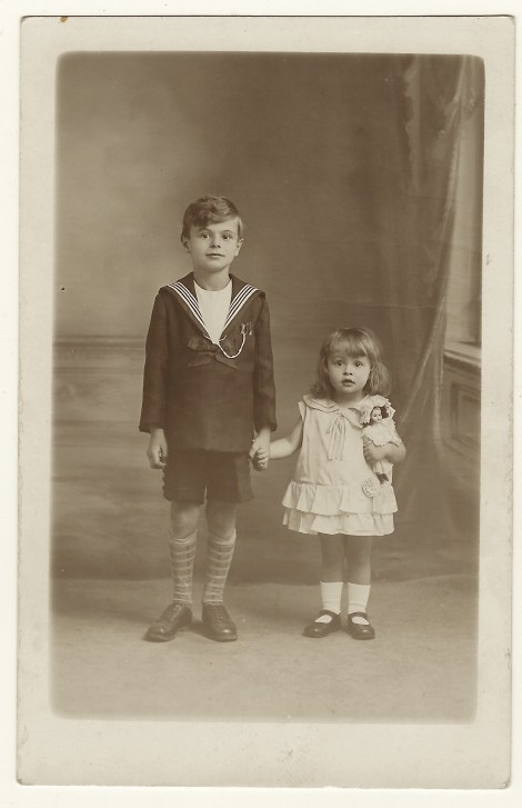 This real photo postcard features an adorable brother and sister. The siblings are holding hands as they pose for this studio photograph. The boy looks handsome in his sailor outfit and the little girl appears precious as she holds her doll against her body. This postcard is of French origin and dates back to the 1920’s. (SOLD)