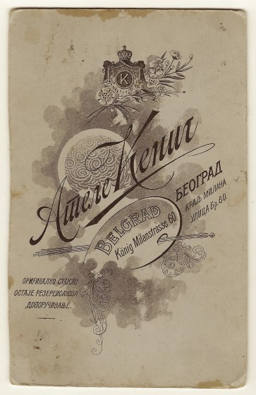 The name of the atelier is written in Cyrillic it actually reads Kenig/ König like king in German. The name of the owner was Leopold König (1853-1906) He had numerous ateliers in Belgrade, Novi Sad and other cities across Serbia.