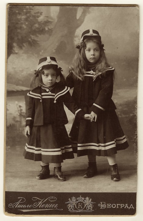 The sisters seen in this cabinet card image are absolutely precious. They are also adorably attired in matching dresses and hats. The dresses have a bit of nautical style. The photographer of this photo portrait is Amere Kehur (Kenur?), at least that is how I decipher the script printed below the image. Kehur’s gallery was located in Belgrade which is the capital of Serbia. SOLD