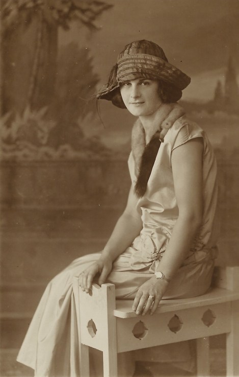A pretty young woman sits on a bench and has her photographic portrait taken at the New York Studio in Passaic, New Jersey. She is wearing a watch, ring, and some type of fur animal. This vintage real photo postcard was produced by Defender.