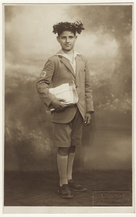 This vintage real photo postcard features what appears to be a young mail carrier or delivery boy. He is carrying a tied packet of envelopes and he is wearing a uniform. A patch on his sleeve reads LMB 117. This image is a bit of a mystery. Is this teenage boy a mail carrier or a student? What does LMB signify? What is the meaning of what the boy is wearing on his head (flower wreath)? There are more questions than answers provided by this photograph. The photo was taken at the Lonyai studio in Bucharest, Romania. The stamp box on the reverse of this postcard indicates that the paper was produced by K Ltd, likely between 1918 and 1936. It is probable that it was produced sometime in the 1930’s. This interesting image has excellent clarity. ADDENDUM: A viewer of this photograph has painted a more accurate picture of what is occurring in the photo. “This boy is being an award winner of his class at the school. That package under his arm didn’t contain envelopes, but books. The page on the top is a diploma. One more thing: that wreath symbolize the laurels with which the Roman emperors adorned their foreheads when they turned victorious from the wars…The best pupil at learning was of course victorious…”.