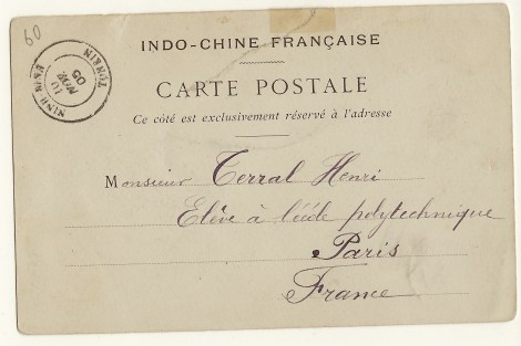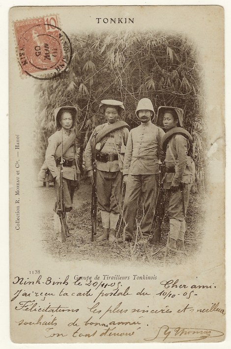 This vintage real photo postcard presents us with a glimpse of history in southeast Asia during colonial times. The postcard features a group of soldiers; three are Vietnmese and one is French. The caption under the photograph describes the group of soldiers as a “Groupe de Tirailleurs Tonkinois”. The Tirailleurs were soldiers comprising several regiments of local ethnic indochinese infantry organized by the French colonial authorities.The Tirailleurs were originally established in Vietnam in 1880. The regiment members in this photograph came from the noted “Tonkinese Rifles”. Initially these regiments were known to have problems with a high rate of desertion. Eventually, with French marine officers, the Vietnamese force became effective. They were positioned to occupy France’s indochinese possessions, These troops also served in Indochina, China (Boxer Rebellion), Russia (1918-1919), Syria (1920-1921), and Morroco (1925-1926). They also participated in World War I. In 1945, some regiments rebelled against the occupation of Vietnam by Japan. Despite a fierce resistance, the Tirailleurs were nearly annihilated. The illustration below shows a soldier from a regiment (Annamite Tirailleur) that fought alongside the “Tonkinese Rifles”. This postcard was published by R. Moreau (Hanoi) and is part of a series (no. 1138). The postcard was postmarked at Ninh Binh in 1905 and has a French stamp. Ninh Bình is a province in North Vietnam’s Red River Delta. SOLD