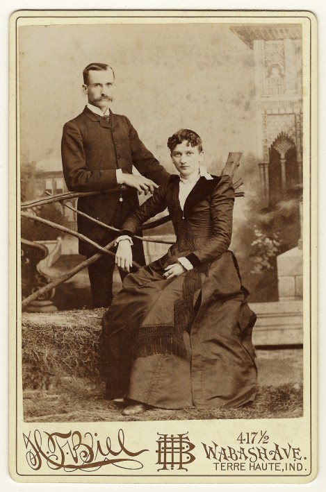 This cabinet card portrait features a portrait of a lovely couple by the Biel studio in Terre Haute, Indiana. The woman in this image is sitting while the gentleman is standing behind her. Cabinet photographs of couples may have only the woman sitting, or only the man sitting. I wonder how it was decided who gets to sit in the chair in the typical couple’s photograph. It is my guess that the ultimate decision is made by the photographer and it is based on creating the pose that photographs best. I imagine that the height of the man and woman being photographed is an important factor in such decisions. The photographer who took this photograph is Henry T. Biel (1855-1929). Biel’s parents were Prussian immigrants. He was married to Francinea E.Fundy in 1879. Biel was listed as a photographer in both the 1880 and 1910 US census. Biel began his photography career at the ripe old age of fifteen. At that age, he became under the tutelage of G. H. Wright, a photographer in Terre Haute. He struck out on his own in 1886 after purchasing the John Adams studio. In time, he became a fixture in the city of Terre Haute as a photographer. In researching Mr. Biel’s background, I began to wonder what the words “Terre Haute” mean. I found the answer to be that Terre Haute was derived from the French term for “Highland”. The name likely was created by early 18th century French explorers who were noting the area’s unusual location above the Wabash River.