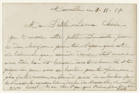 I translated this sweet message, adding punctuation to make it more understandable. Marseilles 11/9/1917: My dear little Léone (Leonie?) darling.