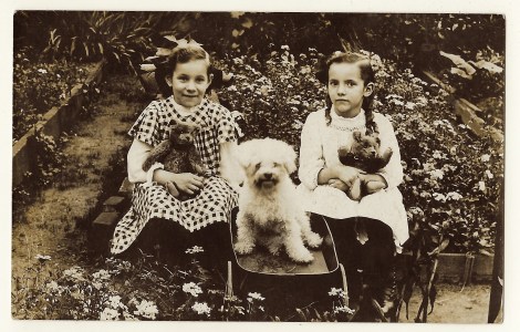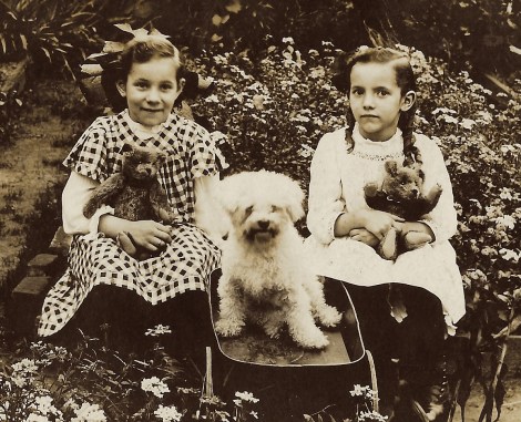 This vintage real photo postcard is absolutely adorable. Kudos to the photographer. Two cute young girls smile as they enjoy their garden party. Invited guests include two teddy bears and a little white dog. The pup is sitting in wagon and appears to be doing a good job of cooperating with the photographer. The party-goers are sitting in a beautiful garden. They are surrounded by lovely flowers. One could get the impression, from looking at this image, that these sweet children may be from a wealthy family and are being photographed at their family’s estate. This photo postcard has a “AZO” stamp box which indicates it was published between 1904 and 1918. Close examination of the front of the postcard (left hand corner) reveals an embossed identification of the photographer. The photo was taken by the Rollins Photo Company of Lisbon, Ohio. Benjamin Rollins (1863-1930) is listed in the 1910 US Census and is reported to be a photographer who operated is own studio/gallery.