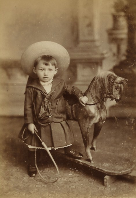 This cabinet card portrait features a little boy holding the reigns of his toy horse in one hand and a whip in the other hand. The child is adorably dressed from head to toe. The toy horse beside him is nearly as tall as he is, and is very realistic looking. The horse even has a mane with real hair. E. I. Ellery is the photographer of this lovely image. His studio was located in the city of Truro which is located in Cornwall, England. On the reverse of the photograph is a very elaborate logo advertising Mr. Ellery’s services. An inscription on the reverse identifies the child as being “Percy Rogers” at two years and two months of age. (SOLD)